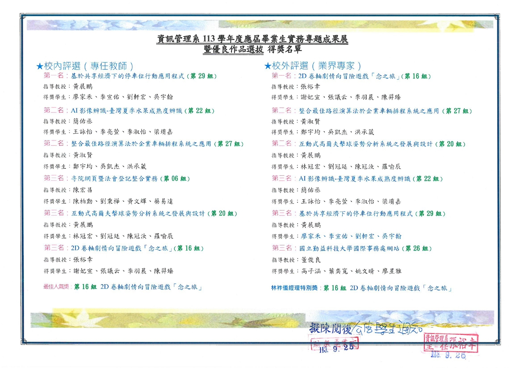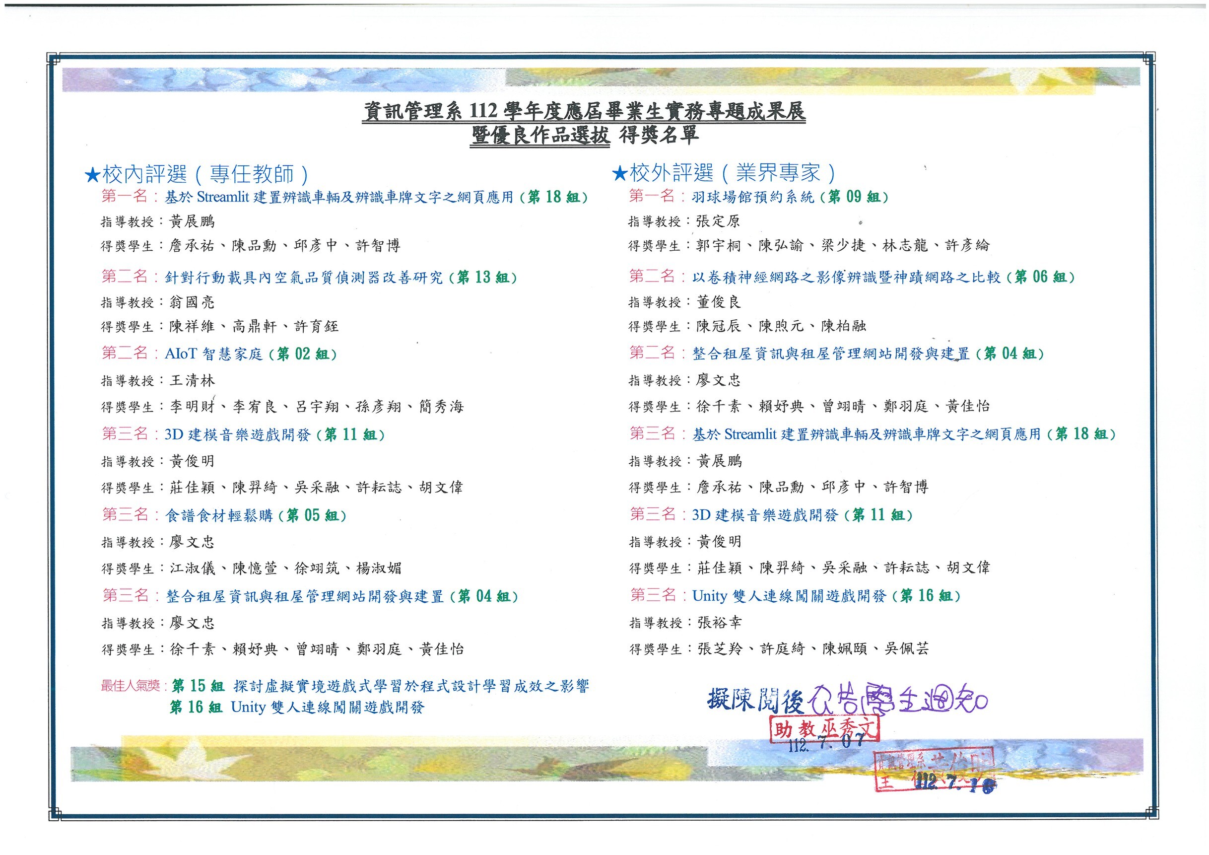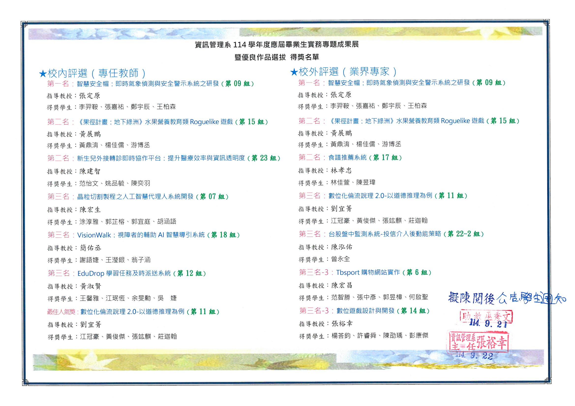 張裕幸老師帶領本系賴世傑、林宸緯、周庠賓、張祐偉同學參與第三屆全國AI圖像辨識應用競賽榮獲專案競賽 佳作